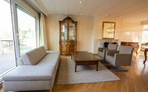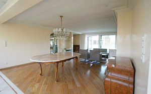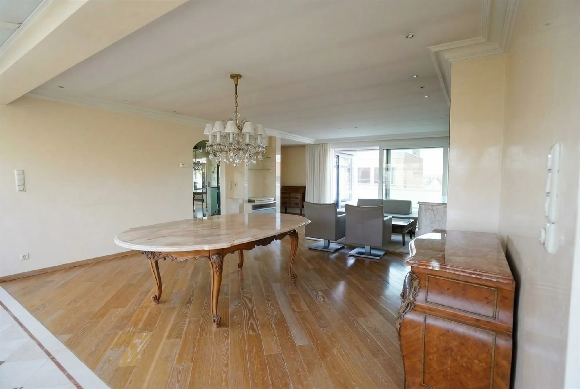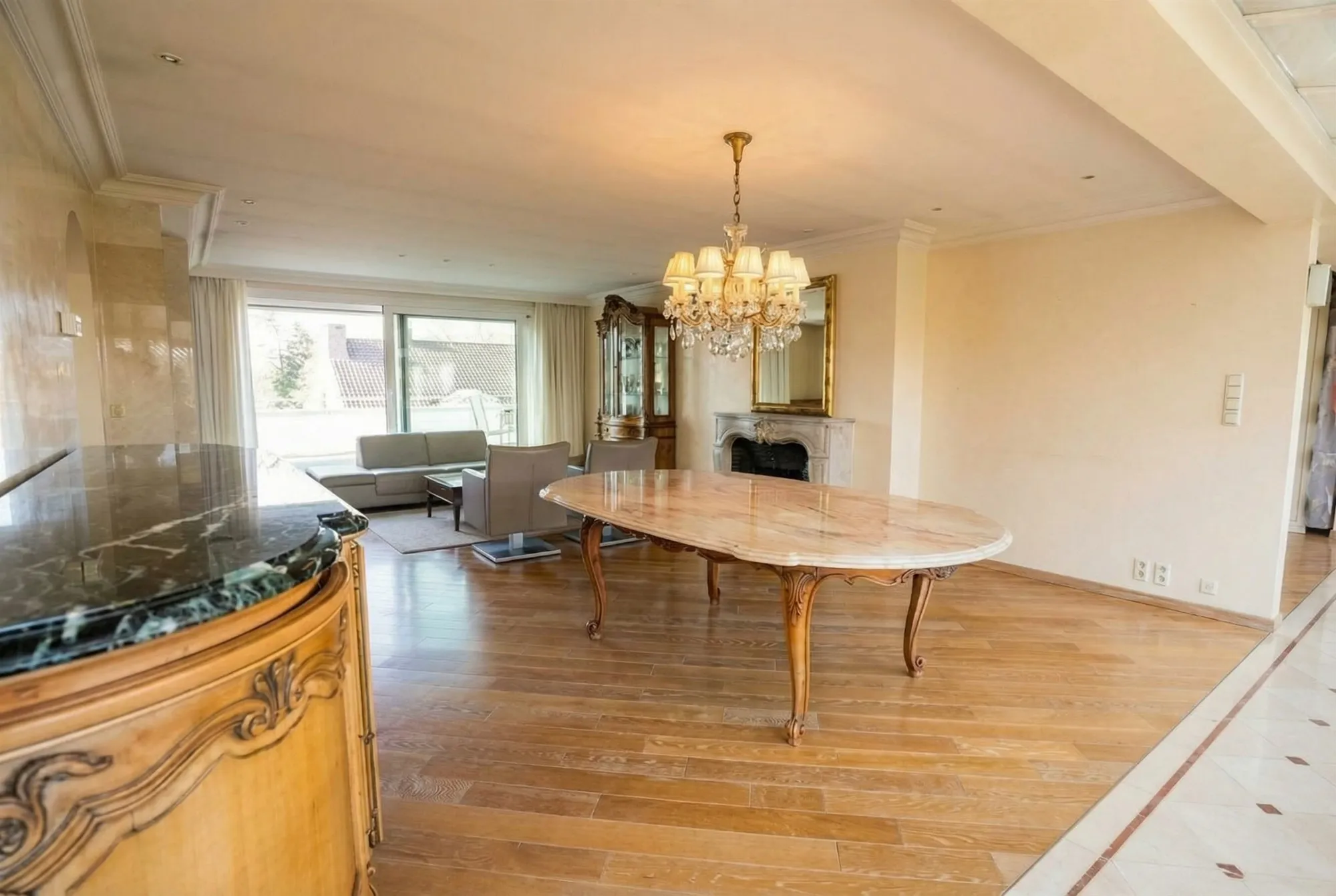 Via de inkomhal komt u in de ruime en lichtrijke leefruimte, gekenmerkt door haar aangename breedte en mooie parketvloer die het geheel een warme en luxueuze uitstraling geeft.
