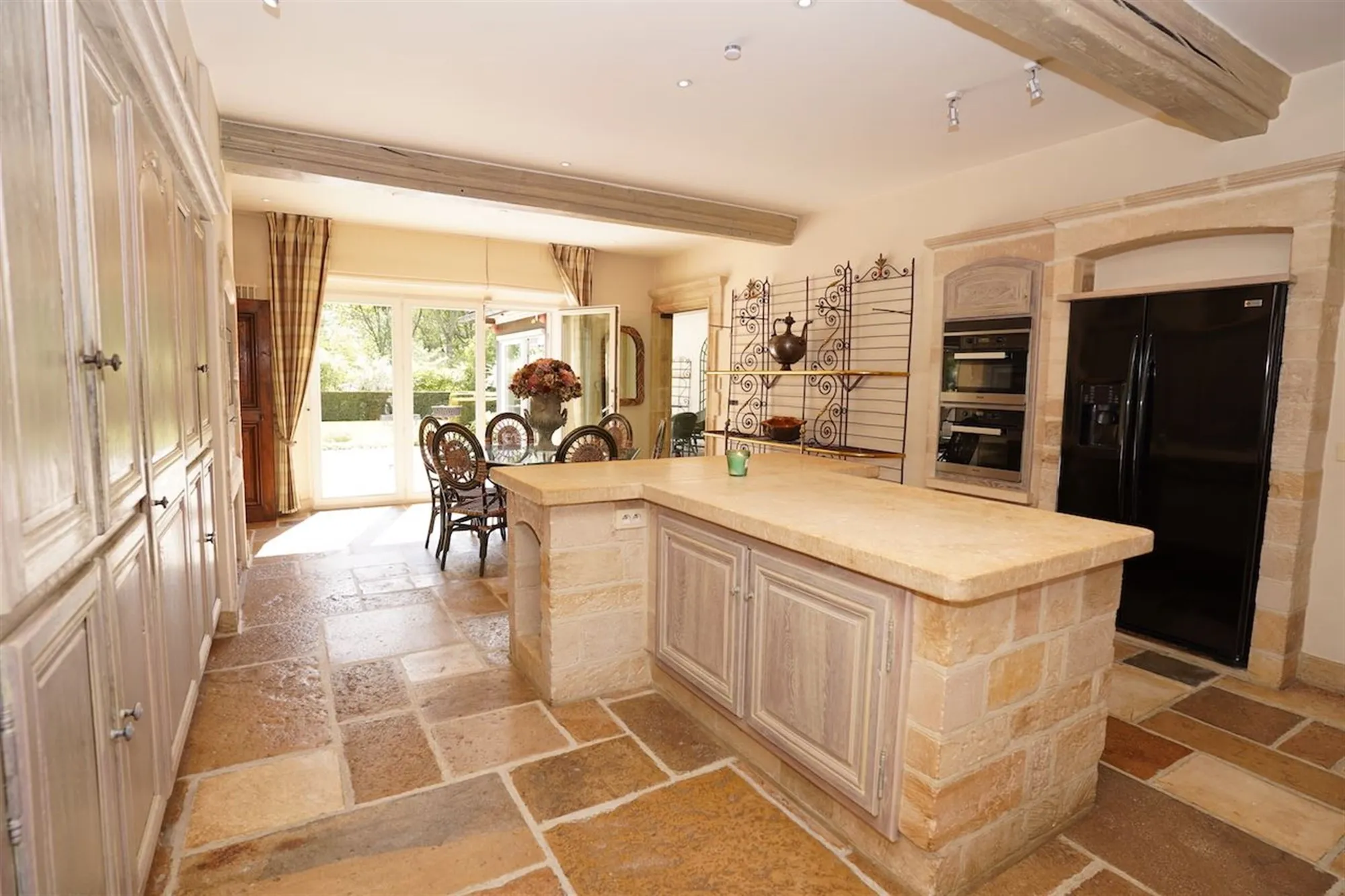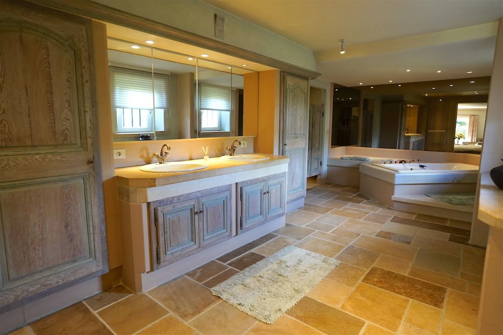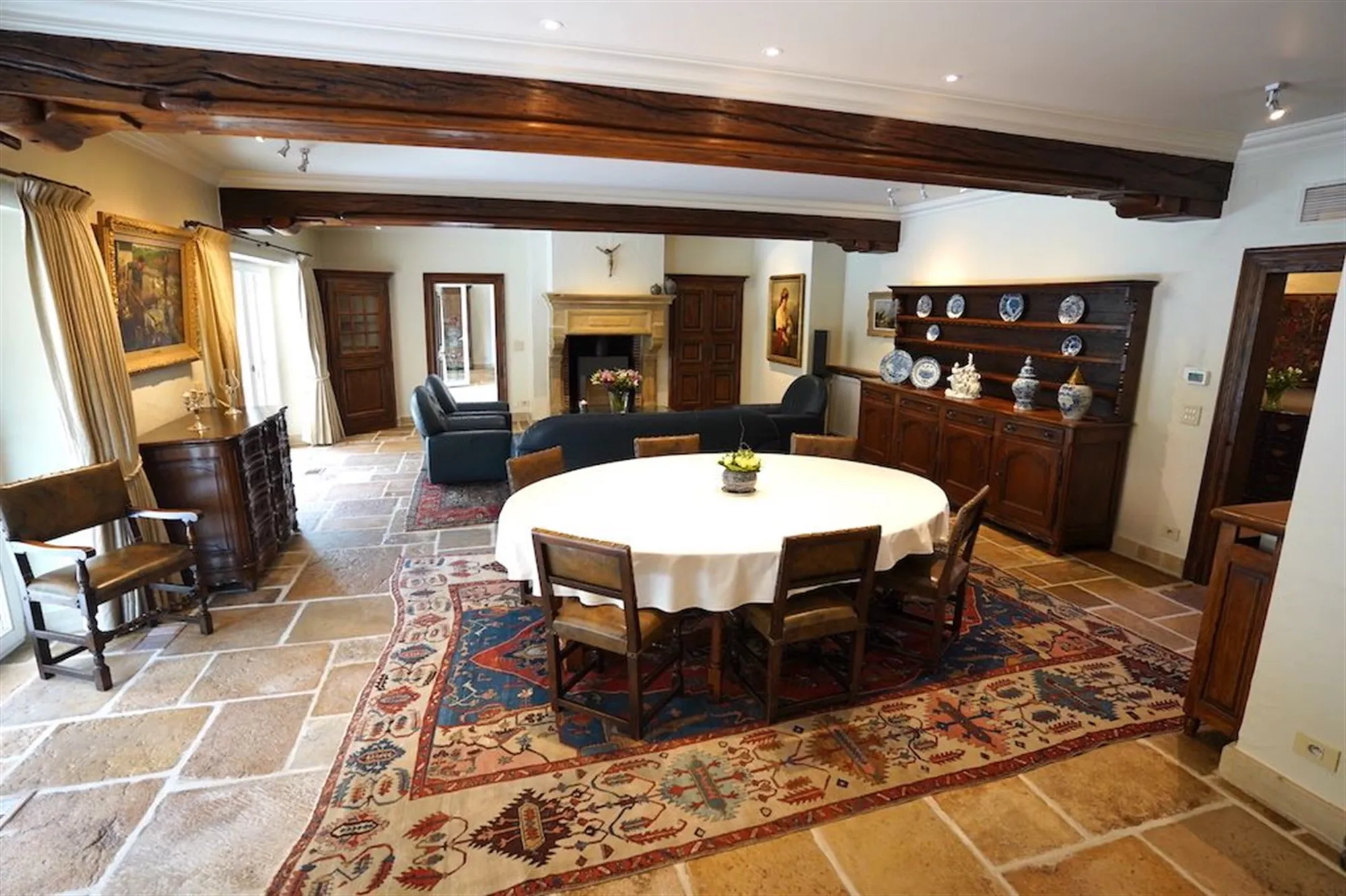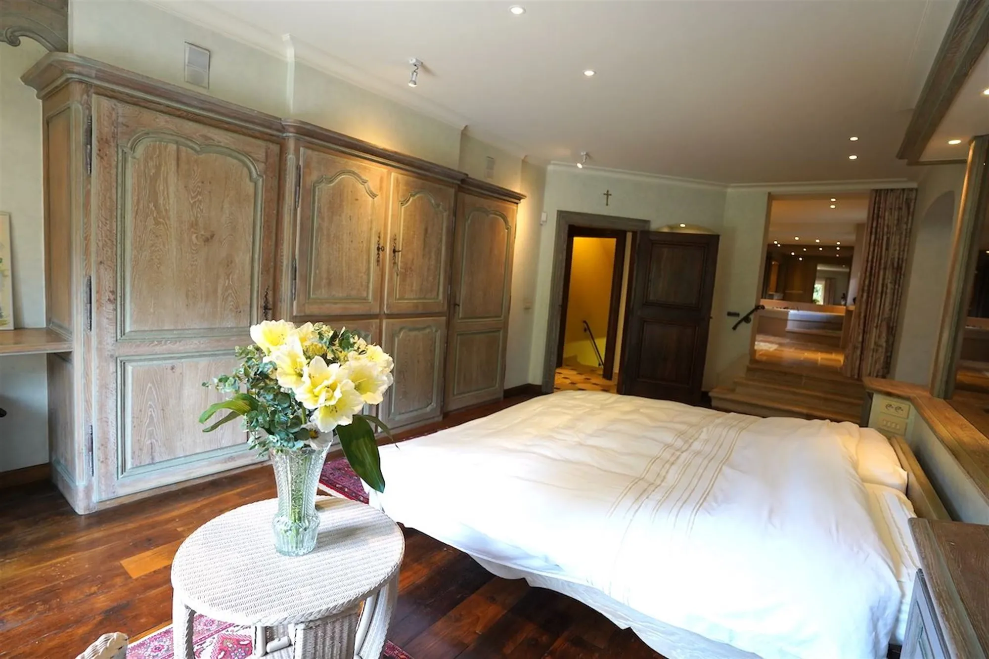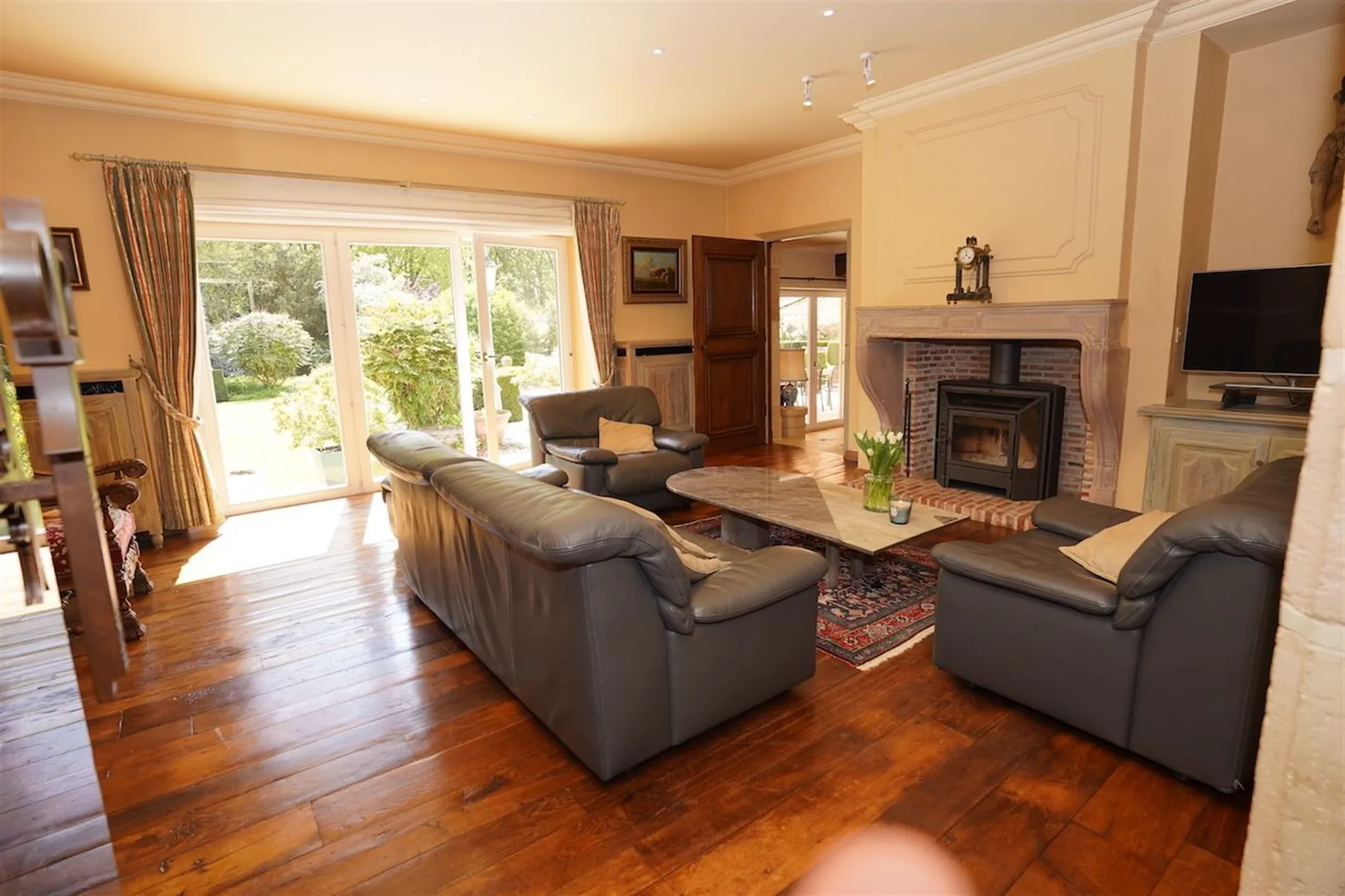 Sfeervolle inkom - gastentoilet - grote leefruimte met inbouwhaard (70 m²) + salon met inbouwhaard (30 m²) - volledig uitgeruste keuken met recente, kwalitatieve toestellen (Amerikaanse frigo, oven, microgolf,grillplaat, friteuse), grote, praktische bijkeuken - orangerie - tuingerichte masterroom met zithoek, dressing en badkamer - groot bureel of kamer met badkamer