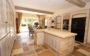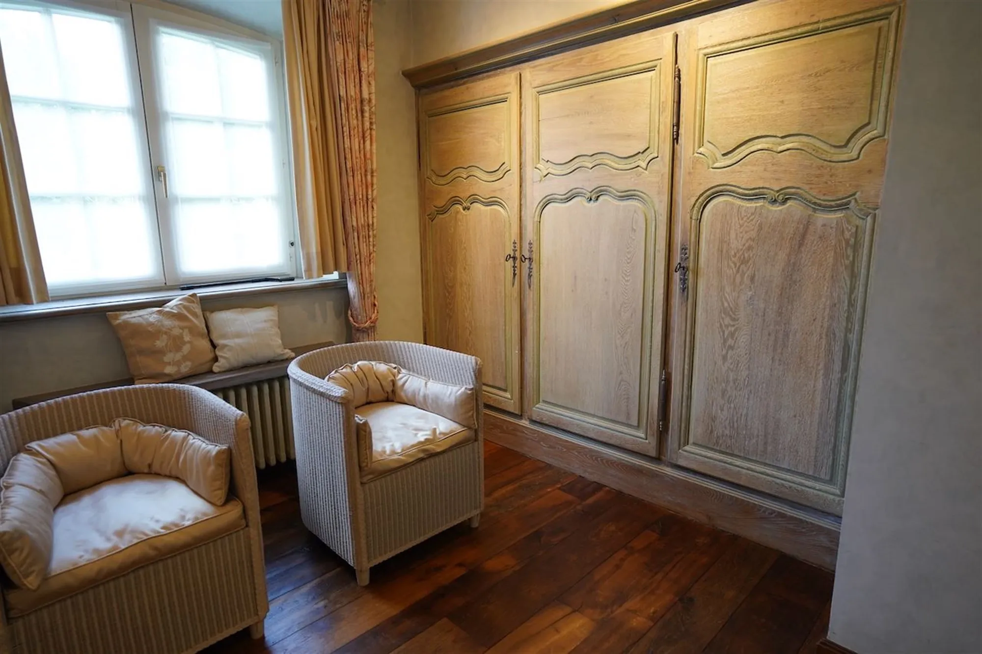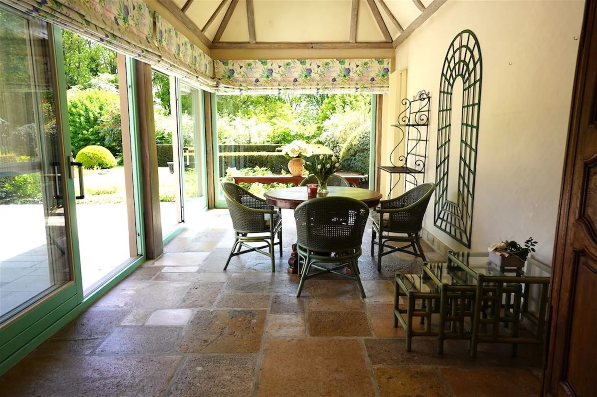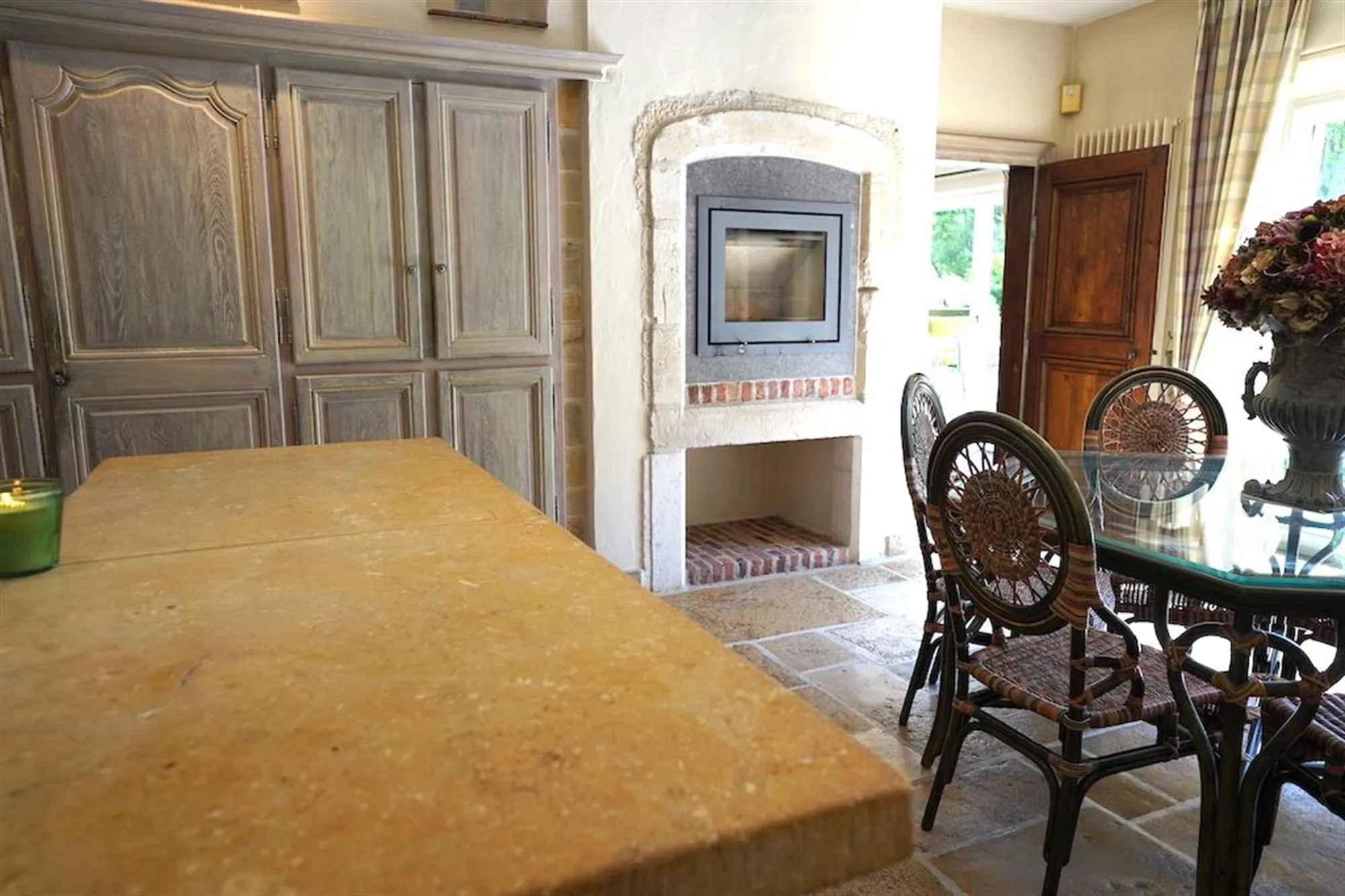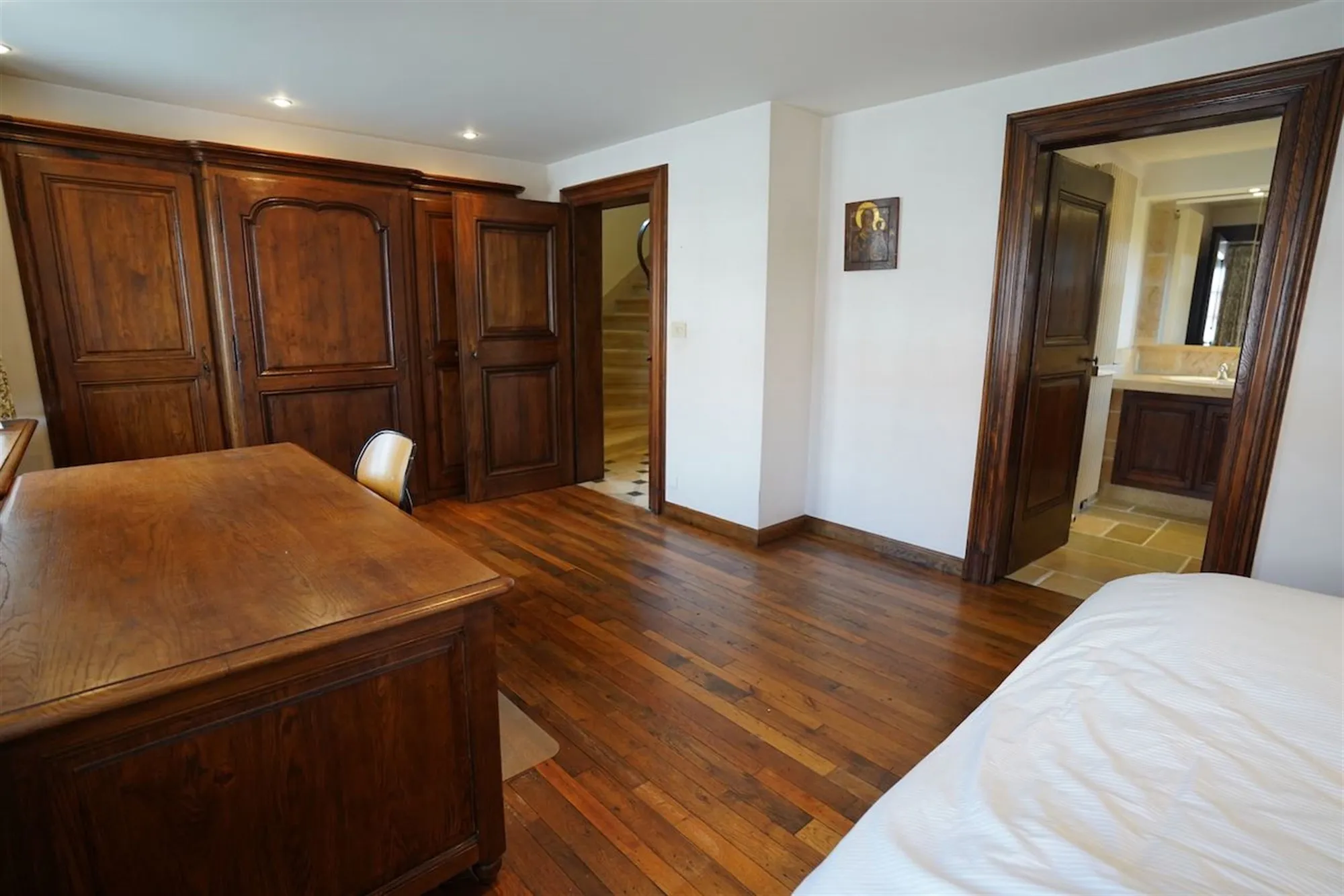 Sfeervolle inkom - gastentoilet - grote leefruimte met inbouwhaard (70 m²) + salon met inbouwhaard (30 m²) - volledig uitgeruste keuken met recente, kwalitatieve toestellen (Amerikaanse frigo, oven, microgolf,grillplaat, friteuse), grote, praktische bijkeuken - orangerie - tuingerichte masterroom met zithoek, dressing en badkamer - groot bureel of kamer met badkamer