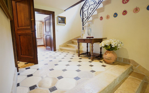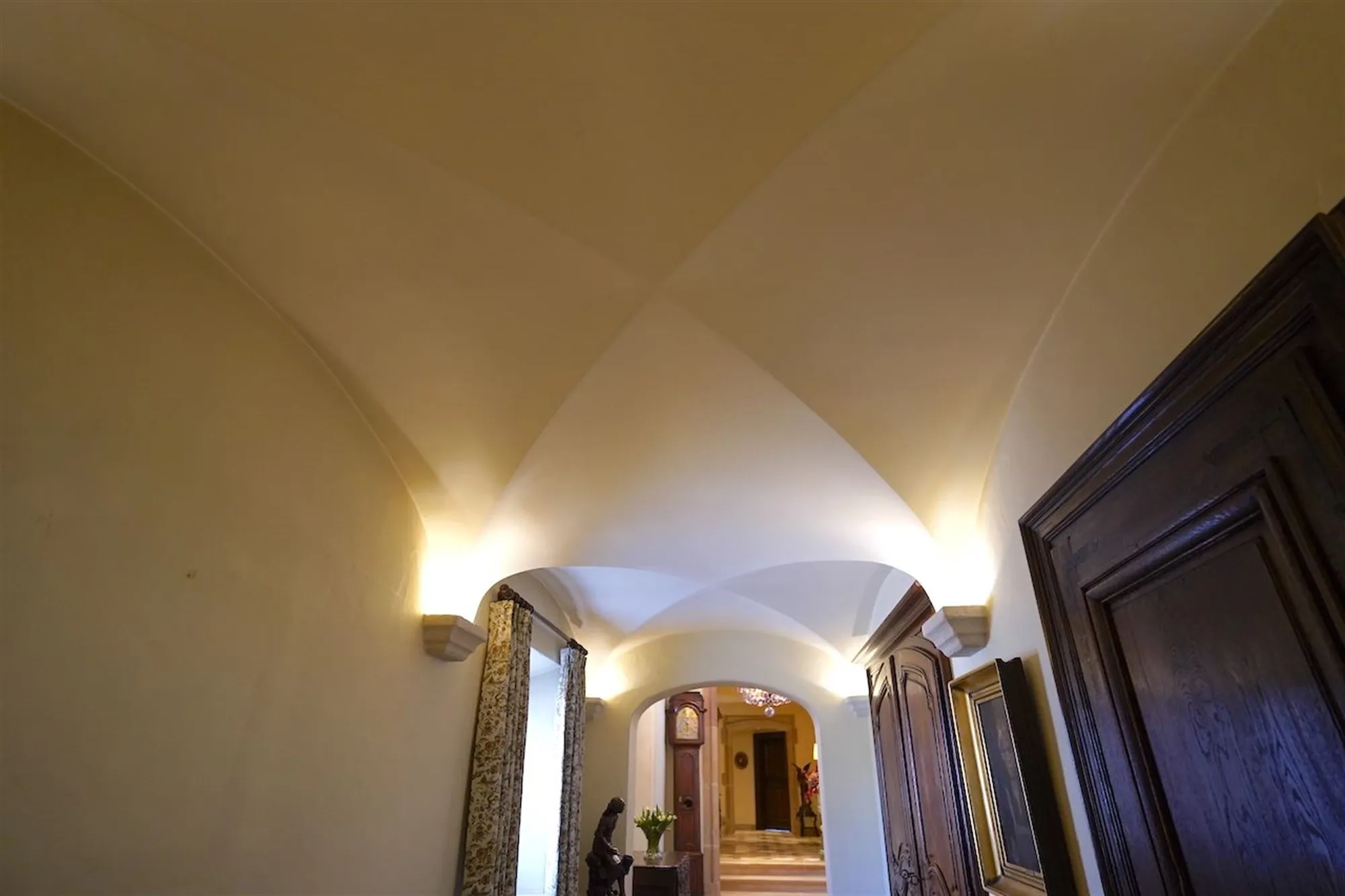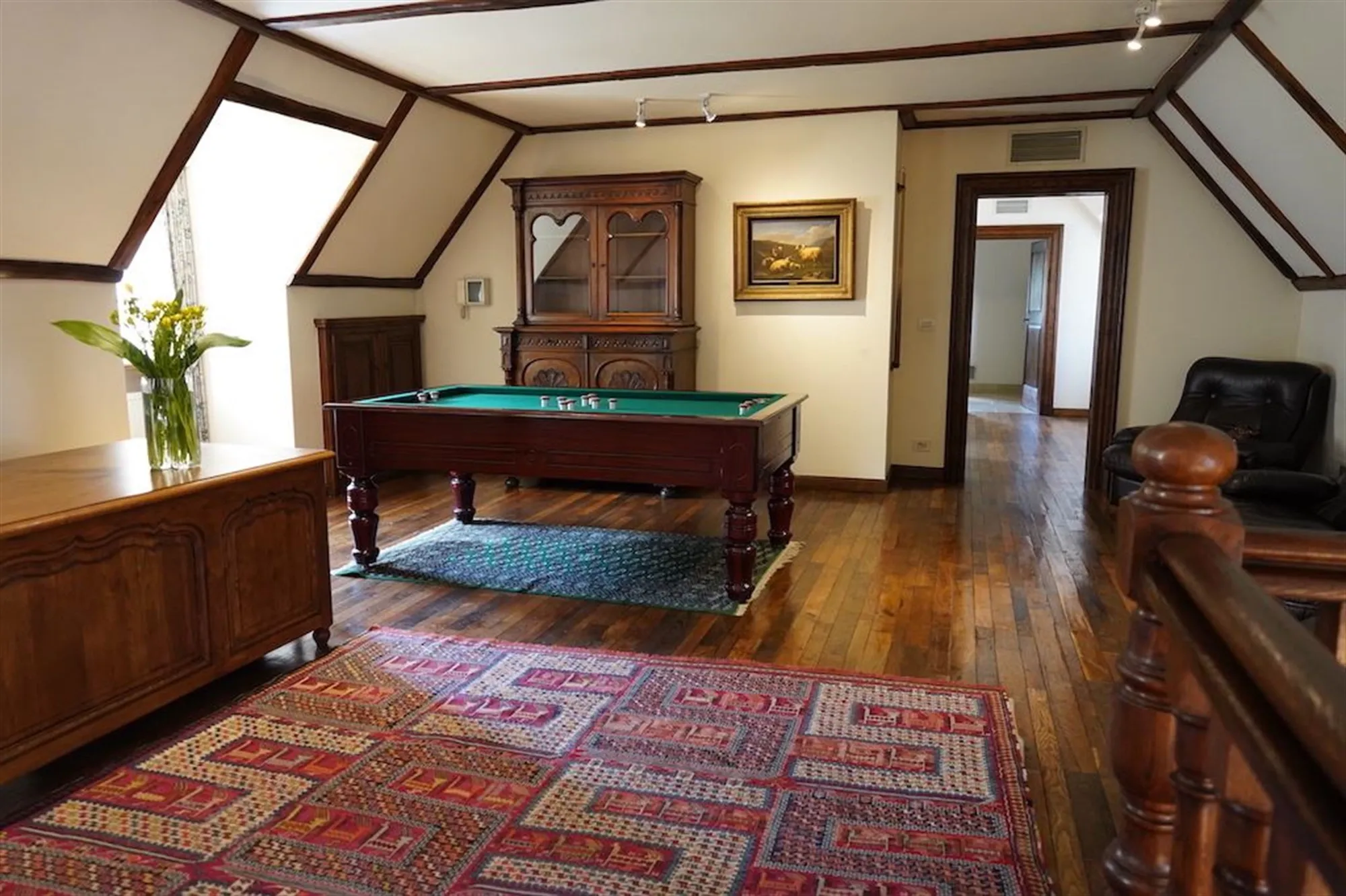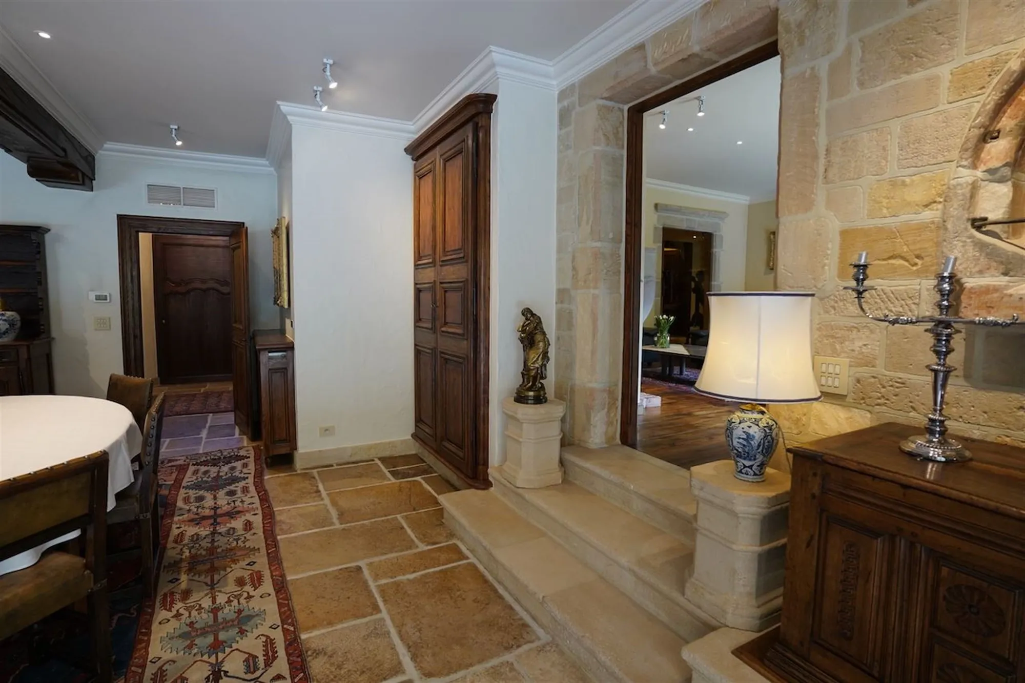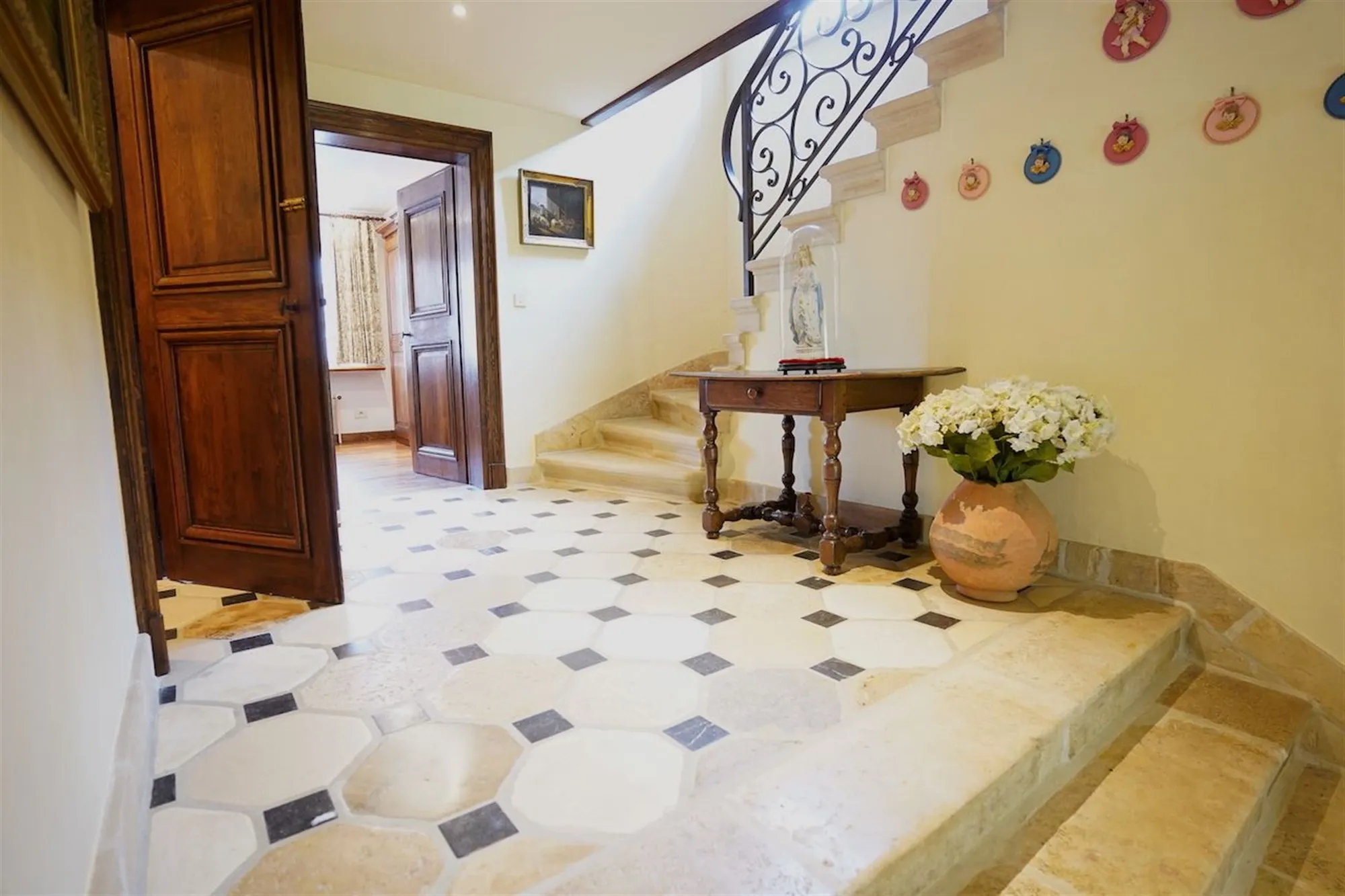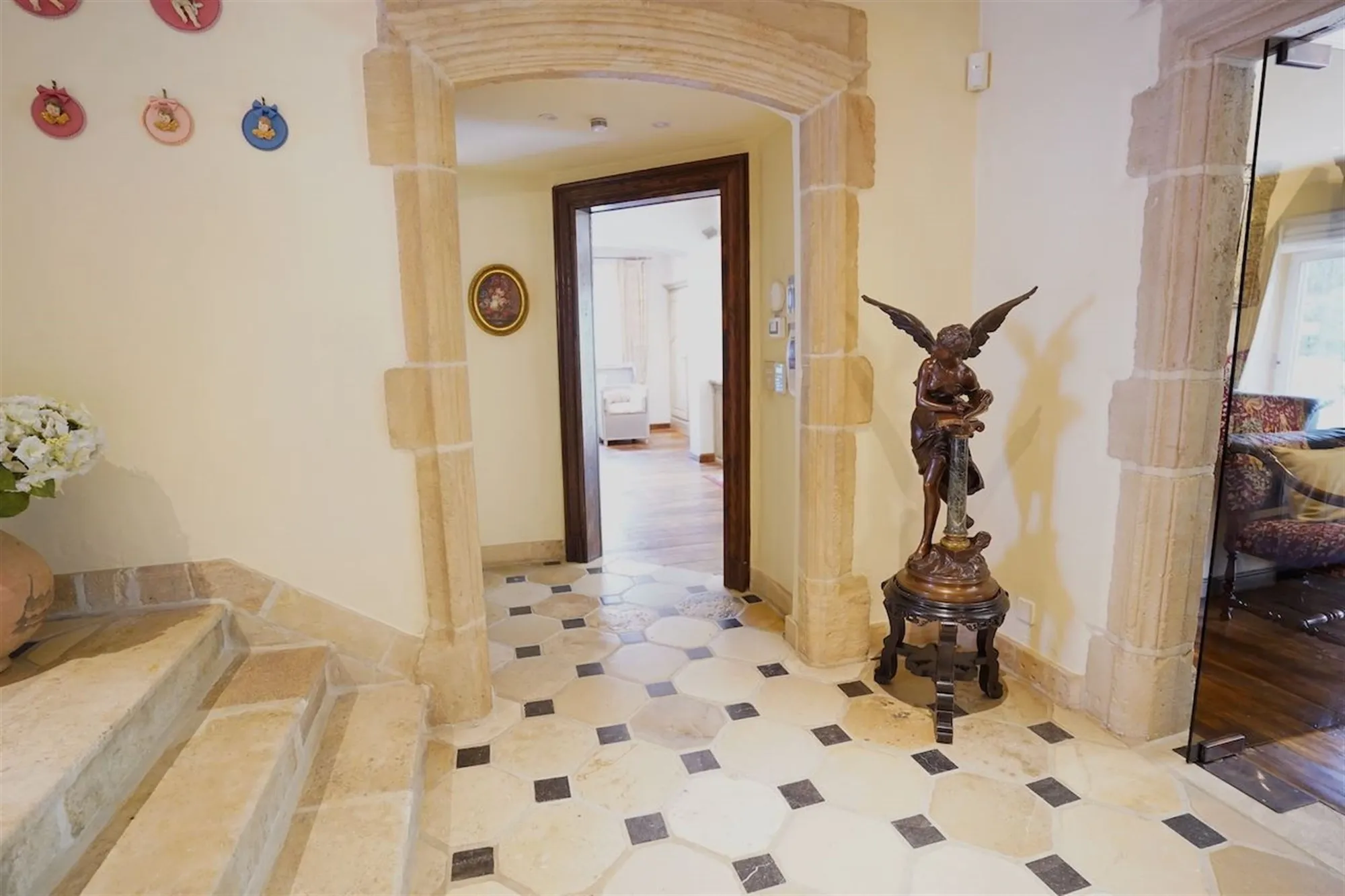 Sfeervolle inkom - gastentoilet - grote leefruimte met inbouwhaard (70 m²) + salon met inbouwhaard (30 m²) - volledig uitgeruste keuken met recente, kwalitatieve toestellen (Amerikaanse frigo, oven, microgolf,grillplaat, friteuse), grote, praktische bijkeuken - orangerie - tuingerichte masterroom met zithoek, dressing en badkamer - groot bureel of kamer met badkamer