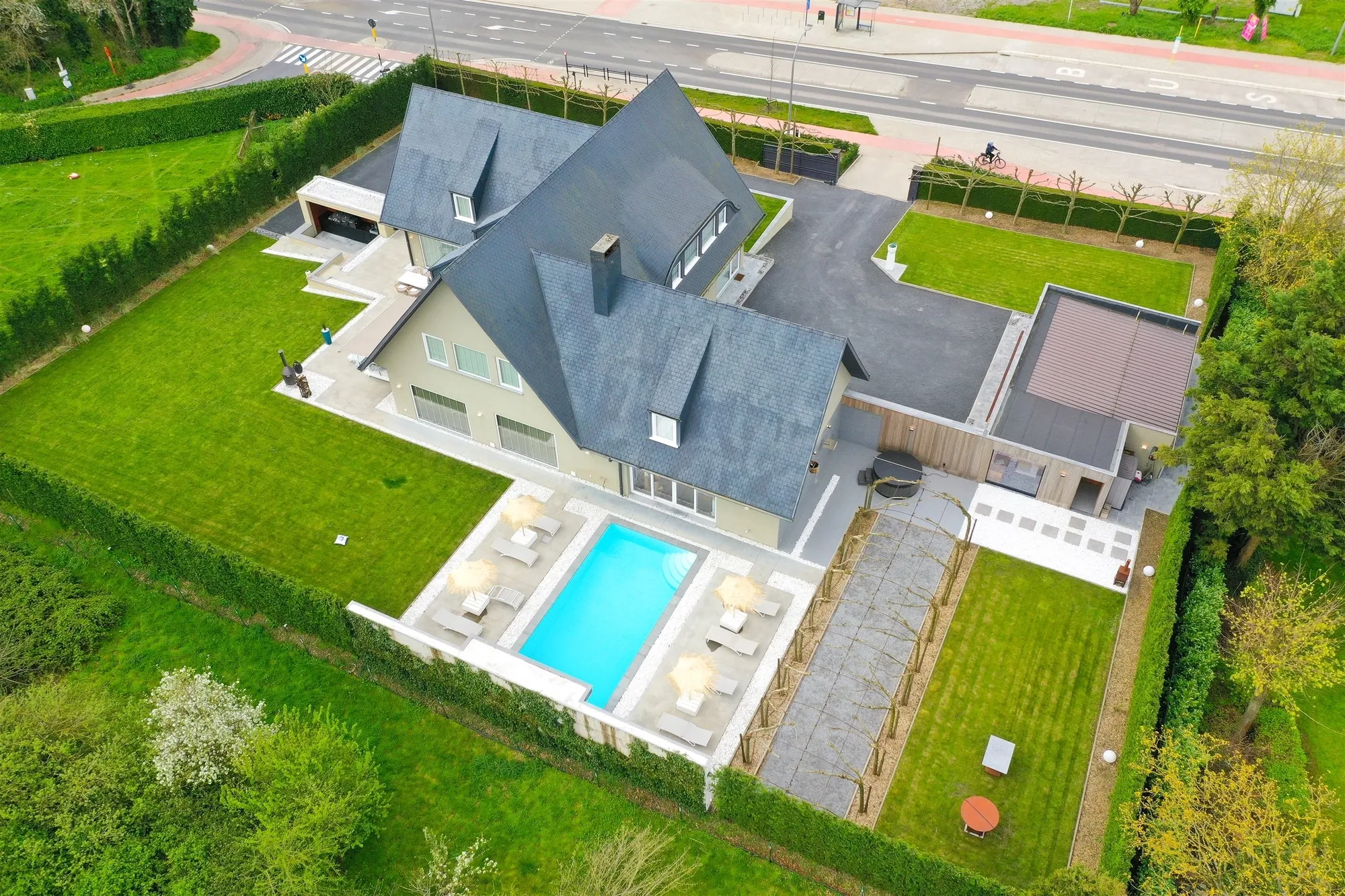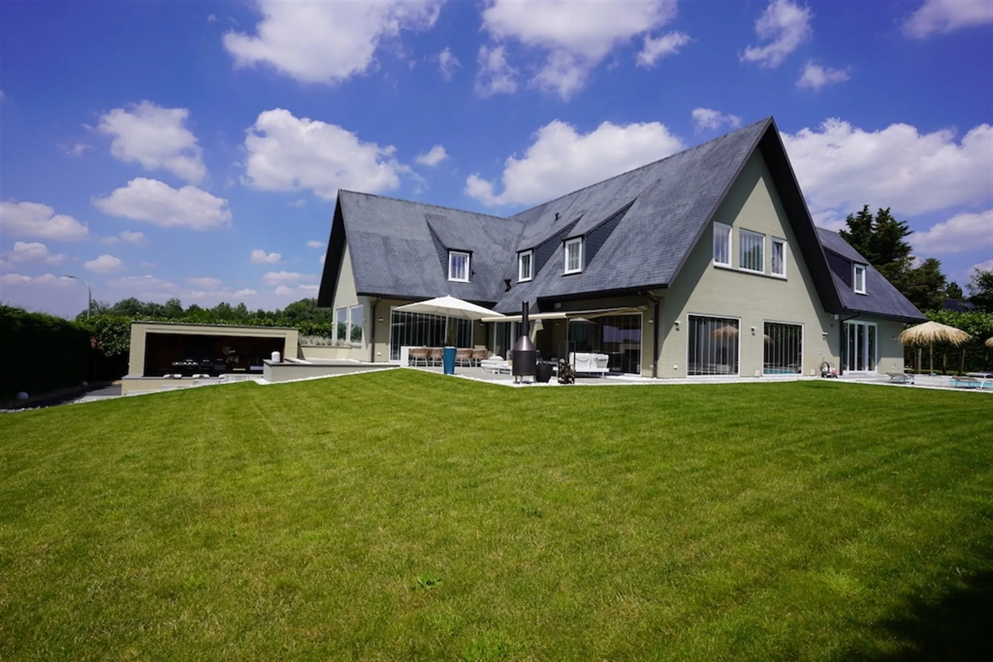 - poolhouse met haard, de wellness met sauna en whirlpool, het verwarmde zwembad met waterval en de buitenkeuken.