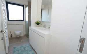 Bereikbaar met lift: inkomhal met gastentoilet - volledige rolstoeltoegankelijk en voorzien van videofoon - Een lichte living dankzij grote panoramische ramen.
